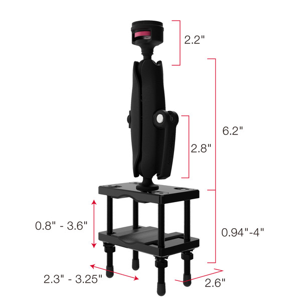 Base Specifications: Fits square/flat or round surfaces up to 3" thick